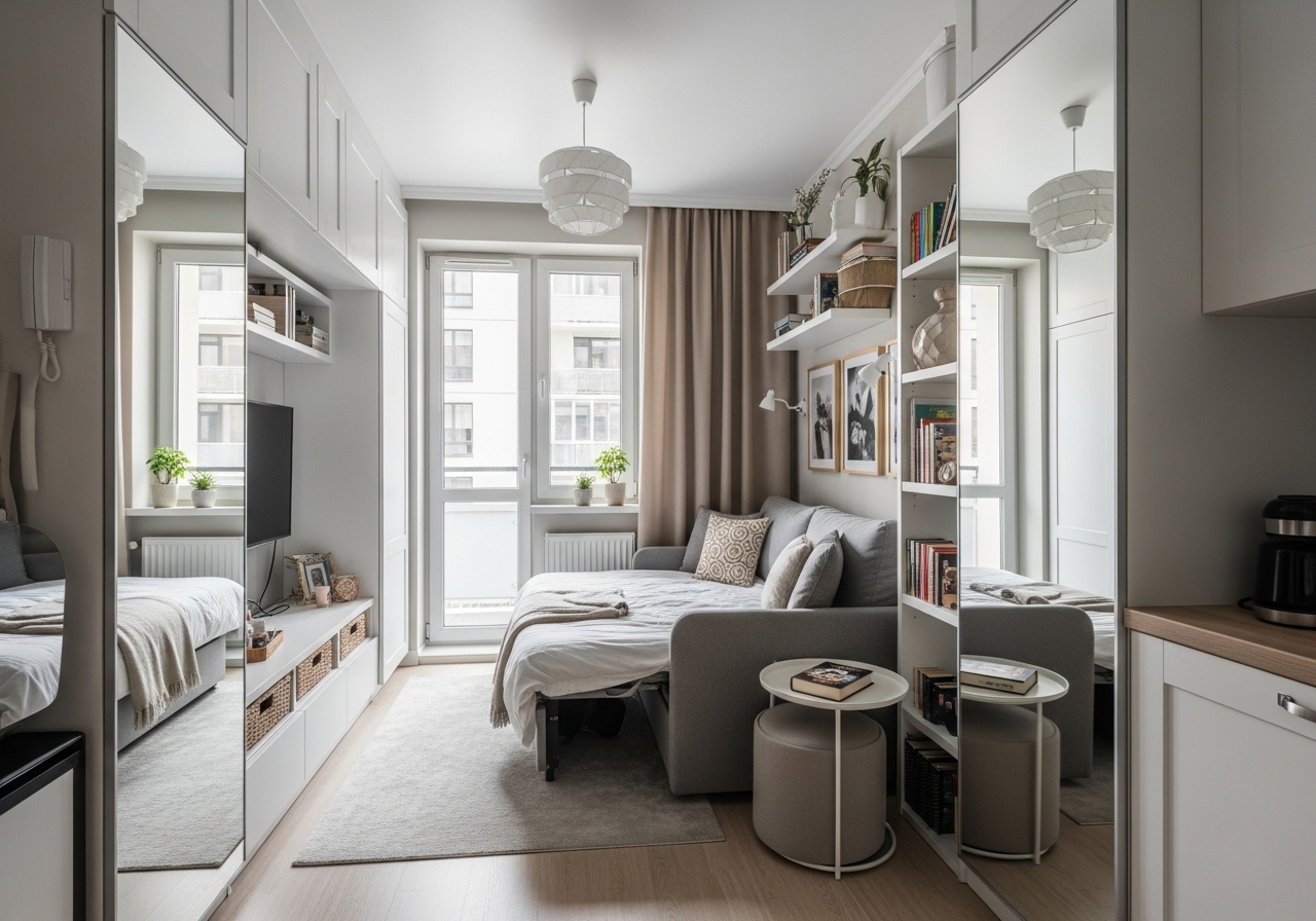 Uma estratégia eficiente envolve mesclar funções em um mesmo móvel. Por exemplo, um sofá com encosto único pode servir como banco para a mesa de jantar. Assim, você usa menos peças e ganha mais espaço livre.