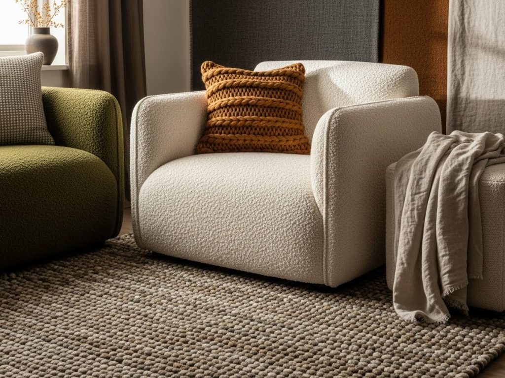 2026 será um ano muito tátil. A decoração aposta em superfícies que convidam ao toque, como tecidos felpudos, bouclé, linho, lã e tricôs.