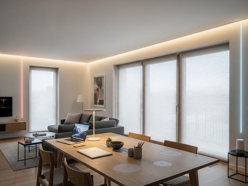 Outra tendência forte de decoração em 2026 envolve tecnologia. A casa fica mais inteligente, porém sem cara de ambiente totalmente tecnológico. Aparecem:
