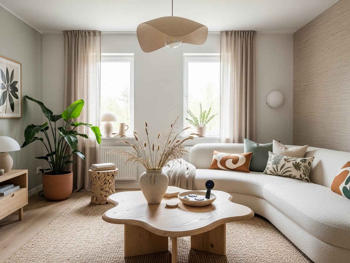 As linhas retas continuam presentes, mas as curvas ganham espaço. Sofás arredondados, mesas com cantos suaves e espelhos orgânicos aparecem em muitos projetos.